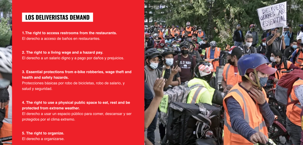 Los Deliveristas Unidos (LDU) is a collective of mostly immigrant app delivery workers who are fighting for justice. LDU is a new organizing effort spawned by the Workers Justice Project to give this vulnerable group of gig workers access to basic rights, such as the right to use the bathroom and a minimum wage. The bitter truth is that many food delivery workers can work 12 hours a day in the cold or rain for multiple food service apps and still not make enough to feed their own families.